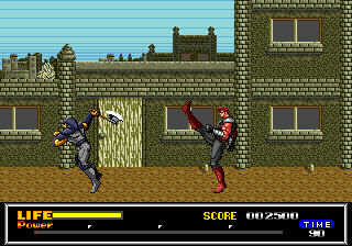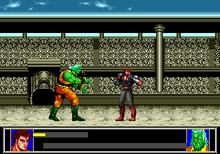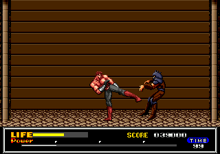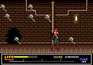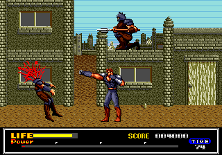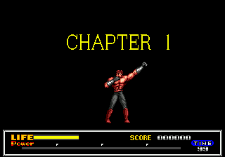 Après l'écran titre, une jolie scène d'exposition où l'on peut admirer l'animation parfaite de notre héros bodybuildé. En haut, un « Chapter One » (sur quatre) apparaît nonchalamment. En bas (1/5 de l'écran), on peut déjà voir ce qui nous accompagnera tout au long de ce voyage : une jauge de vie (oh !), un compteur de score (ah !) un chronomètre (wow !) et une jauge de force en quatre parties (ouais !).