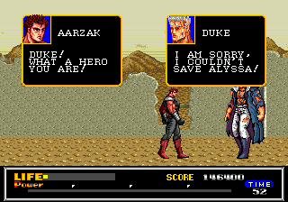 Euh, oui. Vous l'aurez remarqué, il semblerait que l'intro dévoile toute l'histoire du jeu. On a donc une petite raison de ne pas y jouer, puisque l'on connaît les tenants et aboutissants. Quoique. Non, en fait, on ne sait pas à quoi on va jouer. Le combat final, comme il est dit dans le titre du jeu ? Ou toute l'histoire racontée ci-dessus ? Je ne le sais toujours pas, les dialogues auxquels on aura droit tout au long du jeu étant d'une immense futilité, en témoigne l'écran ci-dessus, et bien d'autres par la suite.