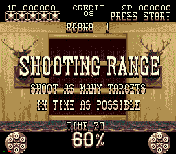 En plus du jeu normal (Arcade,) vous pouvez vous exercer au tir dans un stand à cibles mouvantes, en essayant de faire le meilleur score en un temps impartis. C'est sympa, ça change un peu de temps à autre, quand vous en avez marre de buter toujours les mêmes gangsters décérébrés. L'ensemble est ultra fluide, sans aucun ralentissement ni effacement de sprites (vive le CD-Rom!) Bref, l'ensemble tourne aussi bien qu'une prostituée dans un gang-bang (dédicace Gregoraktor).