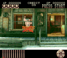 Parlons-en de ces victimes innocentes qui ont la fâcheuse habitude d'apparaître dans les moments chauds (genre le vieil alcoolique du niveau 3, qui traverse l'écran à 2 à l'heure pendant une fusillade de brutes sanguinaires.) Car la plus grosse difficulté (en easy en tout cas) viens de là: ÉVITER DE BUTER PLUS DE VICTIMES INNOCENTES QUE DE GANGSTERS! Et, croyez-moi sur parole, ce n'est pas simple, surtout au niveau 5 où les victimes innocentes prennent parfois des poses menaçantes ("Attention au papy! Il est en train de te braquer avec sa lanterne!! Tue-le, Wes! Tue-le! Mais tue-le!")