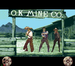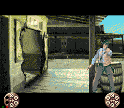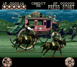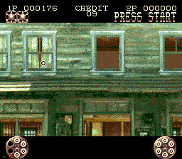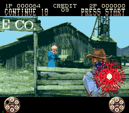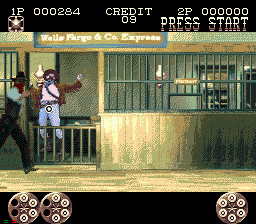 Mais je m'égare! Jetons un œil à "l'histoire" (désolé, mais ce terme me fera toujours rire pour un jeu d'arcade ^^) : 1873, dans le Far-West. Vous êtes un shérif lambda chargé de faire la loi dans cette contrée où ce mot a perdu tout son sens. Alors, histoire de rentabiliser l'étoile dorée qui orne votre gilet en cuir, vous sortez votre bon vieux Smith & Wesson et votre Colt Pacificateur, votre ceinturon et votre chapeau, votre bite et votre couteau, et vous partez éradiquer la vermine qui infeste ce bled paumé de l'Amérique profonde (yipee!!)