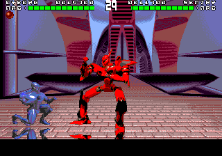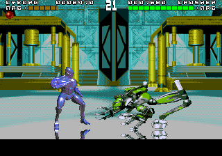 Ce titre, c'est avant tout un copieux martelage publicitaire. Un éditeur qui a cherché à manger à tous les râteliers en distribuant son jeu sur à peu près tous les supports disponibles alors : arcade, Super Nintendo, Mega Drive, Game Boy, Game Gear, Master System 3DO, PC, Amiga, Amiga CD 32 et même CD-i, c'est vous dire. Et qu'essaye-t-on de nous vendre ? Un jeu de combat. Bien. Avec des robots. Ah. Des robots en images de synthèses digitalisées sur Silicon Graphics que c'est les mêmes qui nous ont pondu les dinosaures de Terminator 2. Oh. La note d'intention est là, ça on ne peut pas dire. On ne donne plus dans le sprite à la con dessiné pixel par pixel par des sous-traitants coréens mais dans l'image de synthèse clinquante des presque années 2000. Sauf que dans le cas présent, c'est le jeu tout entier qui est synthétique, le talent compris. Et pourtant on nous l'a vendu la révolution à base de 24Mb cartridge et autres prothèses. Tenez, la jaquette est proche de la syncope tant elle est exaltée : "High Tech Terror !", "Crush the Crusher!", "Real Computer Generated Graphics ! ", "EN GARDE". Dame, rien que ça. On va se calmer un peu là.