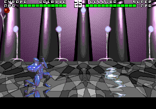 Vous incarnez donc ECO35-2 qui n'est pas une livraison Chronopost mais un cyborg dernière génération dont la spécificité est d'avoir un cerveau humain et d'être en guimauve de synthèse si j'en crois la jaquette. Votre ordre de mission : botter des culs et rétablir l'humanoïde organique au sommet de la hiérarchie. Et quelle est la solution diplomatique adoptée ? L'affrontement mano a mano (ou piston à piston) du leader à la tête de la rébellion (une femelle soit dit en passant) et de ses sbires (oh sbires). Des générations de pas en avant dans le domaine de la robotique pour finalement en revenir à la baston de rue. Asimov s'en retournerait dans sa tombe de carbonite. De l'affrontement tout bête donc. Translation de vecteur mon poing/ta gueule. Soit, j'en prend mon parti et entame mon premier combat de ce Street Fighter métallique.