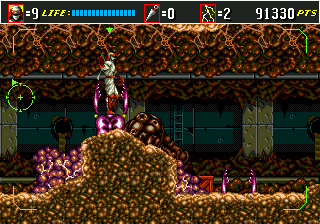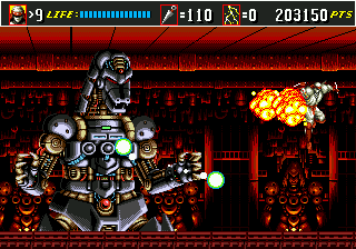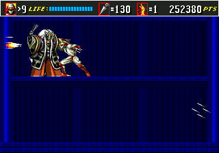 Graphiquement pas si éloigné de son prédécesseur au premier coup d'œil (alors qu'il est pourtant beaucoup plus vieux), "Shinobi 3" s'avère en fait visuellement impressionnant, tant au niveau de l'animation que des graphismes extrêmement colorés et détaillés. Si vous ne me croyez pas, allez baver un peu devant les labos glauques du niveau 3, la forêt en feu du niveau 5, ou encore la forteresse volante du niveau 7. Aucun ralentissement à l'horizon, ni même d'effacement de sprites: aussi colossal soit-il, le jeu gère son support sans trop lui en demander, avec, au final, un rendu confondant. Et puis, au passage, admirez aussi les scrolling différentiels histoire d'annihiler définitivement vos réserves de salives.