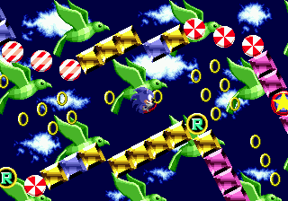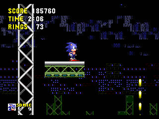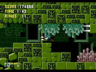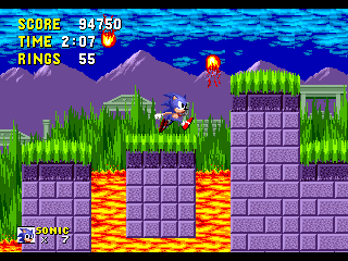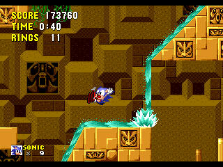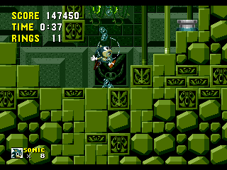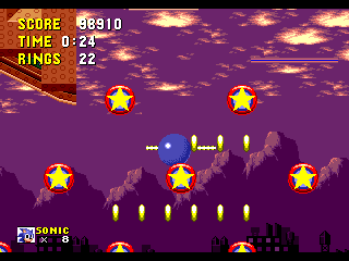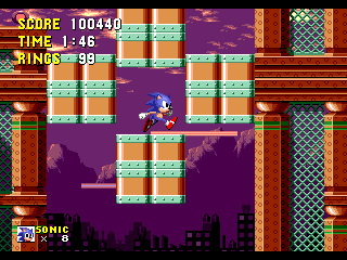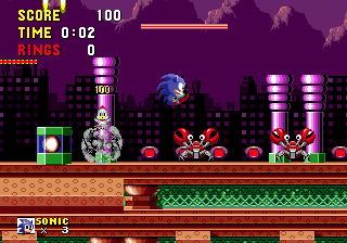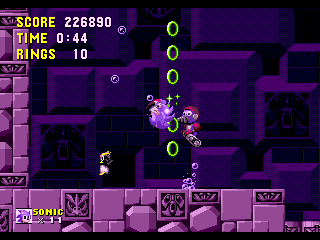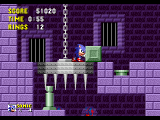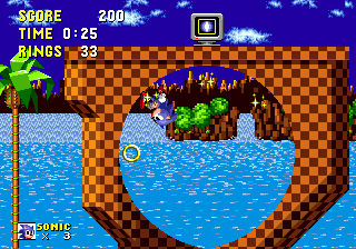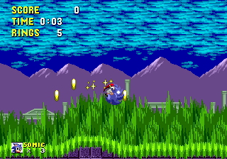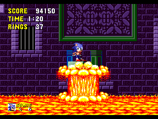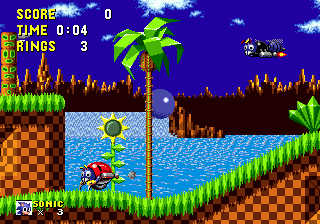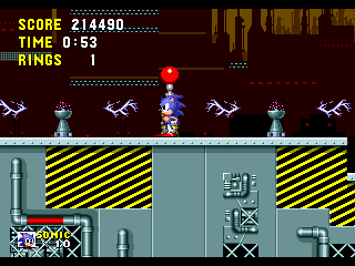 Bon sang! Me revoilà au début! Apparemment, les espèces de triangles gris qui ressemblent à des piques, ça fait mal. Bon, c'est repartit, alors. Ok, je connais bien ce passage, maintenant. Ah, revoilà les triangles: sauter par dessus, sauter par dessus... Ouais!! ça passe... Aïe aïe aïe!!! C'est quoi ça?!? On dirait une grosse coccinelle avec une roue de scooter entre les pattes. Euh... je fais quoi là... MERDE!! Mais ça pique aussi, ce truc!! Il m'a fait paumer mes anneaux!! Eh! Saloperie!! Reviens ici que je te saute dessus! Et PAF!! Ca t'apprendra à me piquer! Saleté...