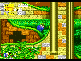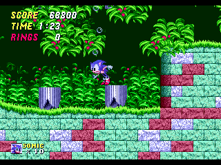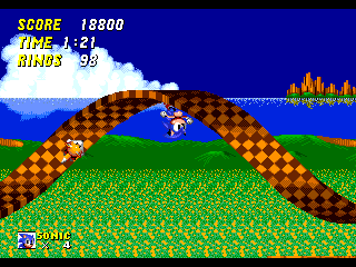 A travers 20 niveaux (acts) répartis dans 11 zones plus 7 Special Stages (avouez, je maintiens le suspense), vous allez joyeusement foncer secourir les petits animaux enfermés dans des machines ou des grosses boîtes de conserve, botter régulièrement le cul d'Eggman et surtout récolter un paquet d'anneaux et de points. Les anneaux restent le moteur du jeu et vous permettent d'accéder aux Special Stages (courage, c'est bientôt), de gagner des vies ou de rester en vie car ils constituent toujours votre seule protection sauf si vous chopez un bouclier ou une invincibilité temporaire. Il n'y a d'ailleurs rien de moins que neuf niveau bonus. Si vous avez plus de 10000 points à la fin d'un niveau, une image de Sonic et une petite musique vous feront comprendre que vous avez gagné un continue. Mais regardons de plus prêt ces zones (le chiffre entre parenthèses correspond aux nombres de niveaux) :