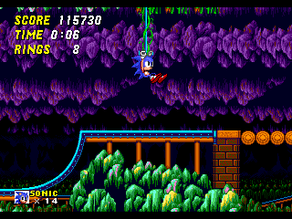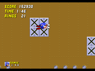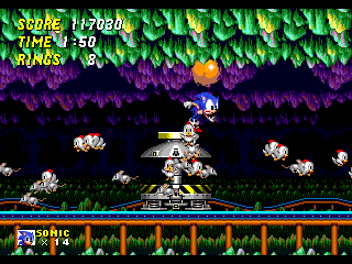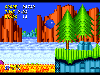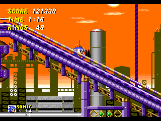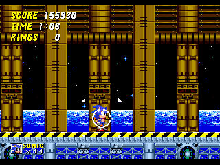 Au rayon nouveautés du gameplay, il est maintenant possible de prendre de faire un burn avec votre héros. Il suffit de se baisser, de bourriner un des trois boutons et Sonic (ou Tails) va commencer à tourner à toute allure sur place. Si vous lâchez, il part en boule tout droit. Mine de rien (ou gisement épuisé, autant que mon gisement de vannes d'ailleurs), cela permet de franchir par mal d'obstacles comme des loopings sans avoir à revenir en arrière pour prendre de l'élan. Ca permet aussi de speeder un gameplay déjà frénétique. En effet et heureusement, le reste du gameplay n'a pas bougé d'un pic de hérisson. On traverse toujours les niveaux à une vitesse hallucinante sans trop se soucier de ce qui se passe. De toute façon, un vrai joueur de Sonic ne lâche jamais la flèche droite (enfin si, s'il tient aux Special Stages. Je vous jure qu'on va en parler). Il se contente de foncer, prendre les anneaux et sauter.