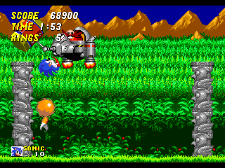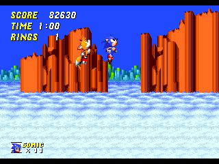 Un petit tour dans les options et on s'aperçoit qu'on peut soit jouer avec Sonic, soit avec Tails soit les deux. Dans le dernier cas, on manie Sonic et le CPU se charge de faire suivre Tails comme un petit chien, ce dernier étant invincible, un brin idiot et totalement inutile mis à part quand il donne deux trois coups sur la tronche d'Eggman. En bref, ne vous occupez pas de lui, il retrouve son chemin tout seul, parfois en volant, ses queues lui faisant office de pales d'hélicoptère. Il sera utile dans les Special Stages mais on en reparlera. Sinon, Sonic et Tails se manient de la même façon à la seule différence que lorsque Sonic court, Tails se prend pour un aéroglisseur toujours grâce à ses queues (de plus en plus vulgaire cet article non ?). À noter que si vous branchez une deuxième manette, un joueur peut contrôler Tails pendant que vous jouez Sonic mais c'est très dur car cela demande une excellente coordination.