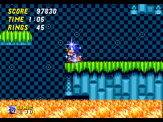 Hill Top Zone (2) : version boostée de la Marble du premier Sonic, Hill Top propose des coulées de lave et quelques rares passages délicats qu'on surmonte à toute allure bien entendu.