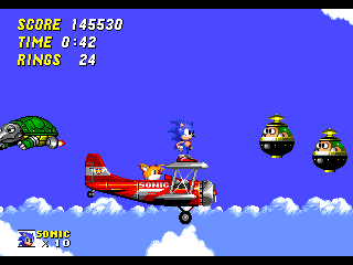 Sky Chase Zone (1) : Tails pilote un biplan et Sonic joue au cascadeur sur les ailes et sert aussi de missile autoguidé contre les ennemis qui vous foncent dessus. Tout cela nous amène à la…