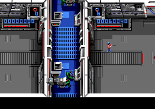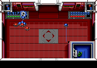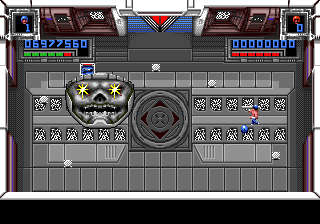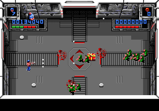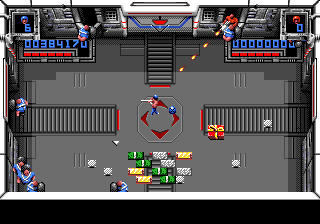 Super Smash TV c'est un marathon, dans ce que la notion à de plus bête et éprouvante. On est moins loin du jogging dans un parc des Hauts de Seine que de la course de fond dans le centre de Sarajevo en 1992. On pourrait même parler de biathlon pour être plus précis. Vous savez bien, ce grotesque sport bâtard né des amours improbables entre le ski et le tir aux pigeons. Précision et endurance donc. La simplicité des règles ne se compare qu'à leur implacable exigence. Le moindre faux-pas, la moindre glissade sur la savonnette est sanctionnée dans l'instant. Dormir c'est mourir comme disait avec mansuétude Gilbert Selzmann. Jouer aussi en fait. La mort vous colle au postérieur comme les casseroles politiques à celui de Jacques Chirac et le jeu saute sur la moindre occasion pour vous tendre un croque en jambe rigolard. Il vous aura à l'usure, guettant le moindre signe de fatigue de votre part, vous usant jusqu'à la corde. Au sortir du premier niveau, vous êtes déjà lessivé, rincé, essoré et étendu à la grand corde des inconscients entrés dans l'arène (un peu comme François 1er). Très rapidement, vous n'êtes plus qu'une machine de viande, ramenée à un schéma primitif où seuls votre instinct et vos réflexes sont votre berger. Un "je te tiens tu me tiens par la barbichette" avec option fusil à proton.
