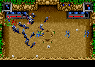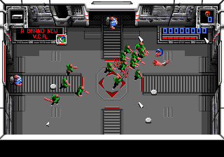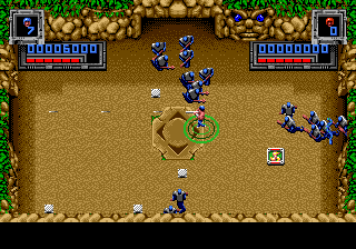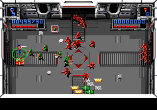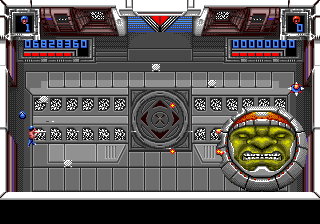 Héritage 80's oblige, Super Smash TV c'est mutant à gogo. Du beau, du gros, du qui bave sur son manche de pioche. J'en profite pour souligner au passage l'avantage du terme "mutant" que constitue son étonnante versatilité. C'est même une sorte de ragout dans lequel on peut y mettre à peu près ce que l'on veut, du moment que c'est laid et méchant. Dans le jeu, le panel va ainsi du soldat anonyme, parmentier à canon, au drone équipé de rôtisseur de fondement, en passant par le pétomane au shrapnel. Et ces amicaux compagnons ne sont qu'un modeste ordre d'œuvre dans le festin que l'on va vous envoyer dans la panse. Le point commun entre tous ces joyeux drilles : arriver par vagues entières et déterminées à faire de vos meules de la viande à kebab. Car des abominations en tout genre, on va vous en envoyer sur le coin de la hure par paquet de 24, avec les 20% gratuit en plus et à un rythme d'usine chinoise. Et c'est là que l'on titille du doigt le cœur du jeu.