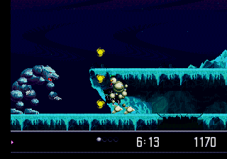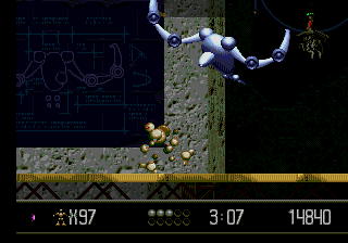 D'entrée de jeu la Megadrive se démène comme un diable pour nous en mettre plein la vue. Sans que l'on ait demandé quoi que ce soit, on se mange un paysage avec scrolling différentiel en arrière-plan à vous faire pleurer des larmes de bonheur. La machine rivalise d'audace et ose même les variations d'éclairage, le héros de métal devenant ombragé lorsqu'il passe à couvert. Certes, les esprits persifleurs souligneront qu'il s'agit d'un simple changement de teinte au niveau des sprites. Mais on les emmerde. Sachons profiter de la simple beauté d'une poignée de pixels finement ciselés. Le niveau sous la mer est du même tonneau avec ces rayons de lumière délicieusement filtrés par l'eau. Rajoutons-en même une couche avec les autres niveaux, qui jouent délicieusement avec des tonalités claires-obscures, l'obscurité d'encre en contraste avec la lumière brute. Oubliez les univers chatoyants et hauts en couleurs des ténors du genre, tels que Gunstar Heroes ou la mythique série des Contra . Ici on fait des économies d'énergie et on éclaire au minimum. Les couloirs sont aussi sombres que l'esprit d'un militant d'extrême-droite. On est dans un futur qui pue, rappelons-le. Les rares fois où vous vous baladerez à l'air libre, le temps sera pourri. Des nuages, du froid et des précipitations dans le Golf de Gascogne. Et tout le charme du jeu viens de cette obscurité, froide et inquiétante. La console n'y va pas avec une demi-molle et tant d'amour du travail bien fait réchauffe le cœur, aussi synthétiques soit-il. Au delà même des graphismes rutilants, c'est la fluidité de l'ensemble qui force le respect. D'aucuns se souviendront du boss mécanique de Castlevania Bloodlines sur la même console et de sa splendide animation. Vectorman c'est pareil, en mieux. L'assemblage métallique se meut avec une décomposition de mouvement qui en aura surement laissé plus d'un pantois à l'époque où la capture de mouvement n'était qu'un vague concept.