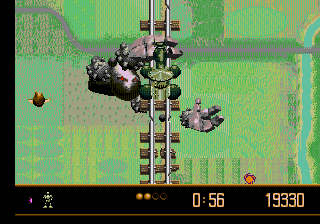 Dès le deuxième niveau, ô surprise, le jeu change radicalement d'approche. En lieu et place du niveau de plates-formes précédent, on se retrouve aux commandes d'un tank roulant sur rails en altitude, le tout sous la forme d'un ersatz de shoot-em up vertical. Un gorille robot (voire plus bas la note concernant les cyber-bestioles) tente mesquinement de vous faire dérailler en barrant la voie des ses paluches métalliques et probablement sales. Une fois de plus, la dame en noir de SEGA se secoue les tripes pour notre bonheur en ajoutant des déformations et effets de perspective qui forcent le respect. L'exercice est cependant de courte durée puisqu'il s'agit en fait d'une des phases de bonus courtes mais fun qui parsèment l'ensemble. Le jeu sera rythmée ainsi, des petites friandises de ce genres venant faire office de charnière entre deux niveaux. Vous aurez ainsi droit à un jeu d'adresse sur une piste disco, un jeu de cache-cache écrabouille (concept) et même un rigolo clone de Zoop. De délicieuses cerises confites sur un excellent gâteau. Miam. Pour tous ces passages, un seul mot d'ordre : de l'action. Il faut que ça bouge, hop hop hop. Pas d'éléments superflus, on est pas là pour tricoter du gazon.