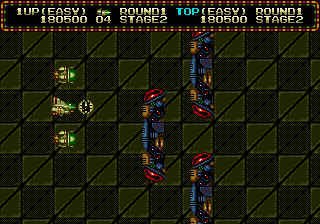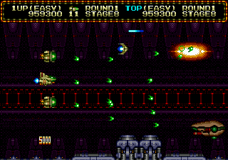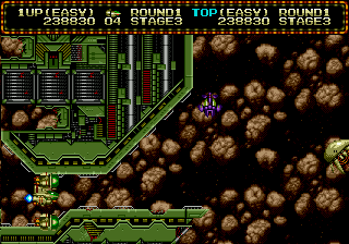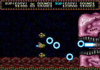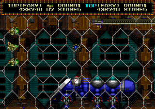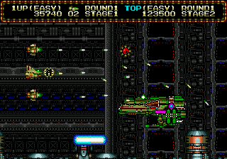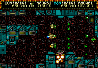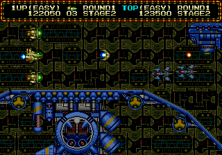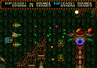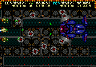 En parlant des armes, celles-ci sont on ne peut plus classiques. Un tir frontal simple, un laser bleu qui traverse tout, et qui permet ainsi de transpercer une rangée d'ennemis en un seul tir ou d'avoir des ennemis cachés derrière des murs, et enfin un homing vert. Il y a enfin deux options qui viennent se placer de part et d'autre du vaisseau, et qui élargissent ses perspectives de tir tout en lui protégeant le ventre et le dos, un turbo et un bouclier frontal. Il faut savoir enfin que le vaisseau dispose en arme secondaire d'un rayon tracteur permettant de choper un petit ennemi pour s'en servir de bouclier ou de boule de bowling sur ses petits camarades. Cela dit, cette particularité ne sert pas à grand-chose à mon goût.