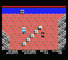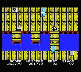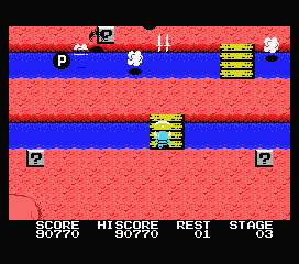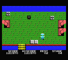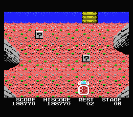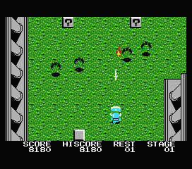 A noter que certaines de ces cases magiques sont invisibles et ne se montreront que lorsque, suite à un tir malencontreux, vous aurez touché de votre arme leur emplacement. Tirez tant que vous le pouvez, c'est gratuit... et payant. Peut-être tomberez-vous sur une vie de plus ou sur un passage menant à un autre niveau. De même, si vous voyez face à vous un bras d'eau sans aucun moyen de la traverser : canardez la zone tout en évitant les assauts ennemis, et espérez tomber sur le bloc caché qui créera un pont.