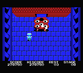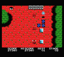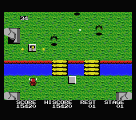 En ce qui concerne les graphismes, et même si la palette de couleurs est plutôt basique et flashy – MSX première génération oblige – c'est très efficace et toujours détaillé. On ne s'y perd pas entre les très nombreux projectiles, les sprites sont fins mais distincts, et les environnements sont assez variés et les ennemis assez pressants pour ne pas créer d'ennui. Cela même si l'architecture générale reste identique : un long couloir, des ennemis à foison et, parfois, des rivières aux ponts détruits. L'avant-dernier niveau - si vous y parvenez - vous fera d'ailleurs regretter l'existence de l'eau...