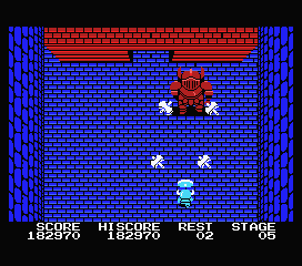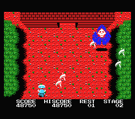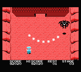 Les ennemis arrivent majoritairement par le haut de l'écran et peuvent, au choix, suivre un chemin sinusoïdal (chauve-souris), aller droit devant eux (boules), faire un huit (sorcières et fantômes), voire légèrement se décaler pour s'approcher de vous (chevaliers). Ca, ce n'est que le premier niveau. Ces opposants, ainsi que les divers projectiles qu'ils balancent dans votre direction, vous tueront par simple contact.