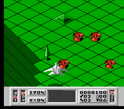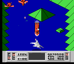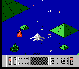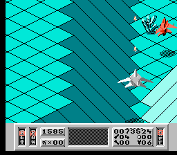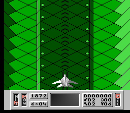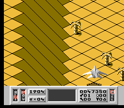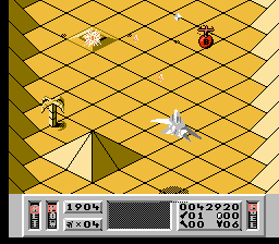 Comme dans Zaxxon, vous pouvez incliner votre vaisseau pour descendre ou monter en altitude. Là encore, on remarque le souci du détail : quand vous tirez avec le vaisseau (qui ressemble à un F-22) incliné vers le sol, les tirs n'iront pas tout droit et rebondiront sur le sol. Mais il est quand même préférable de rester le plus haut possible. Vous aurez ainsi nettement plus de chance d'éviter les reliefs du décor. En effet, durant la première phase de chaque mission, vous évoluez dans une série de canyon avec montagnes, volcans et passages très étroits. En plus d'éviter les tirs ennemis, il faudra constamment faire attention à ne pas se payer le décor sous peine d'explosion immédiate. On tire normalement avec le bouton A et B sert à utiliser les armes secondaires.