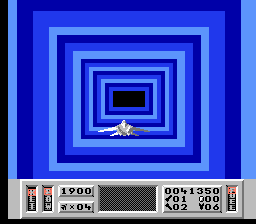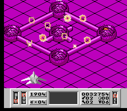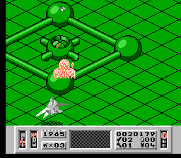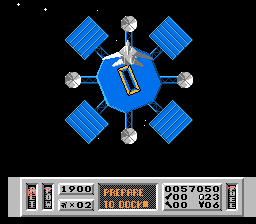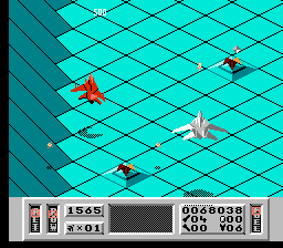 Chacune des 8 missions se déroule en 3 phases. Tout commence par le passage décrit ci dessus dans lequel vous devez soit détruire une base, soit ravitailler des points précis soit sauver un scientifique. Ensuite on enchaîne sur une phase qui fait nettement penser à du sous-After Burner : cette fois, votre vaisseau est vu de derrière et vous détruisez tous les appareils qui passent en évitant leurs missiles. C'est quasiment une phase de bonus stage vu sa facilité et son coté défouloir. Enfin au cours des 7 premières missions, il faudra vous arrimer à une station spatiale ce qui consiste à bien vous placer dans l'axe et à appuyer sur B au bon moment. C'est l'explosion en cas d'échec. Assez crispante au départ, cette phase se révèle finalement très simple une fois qu'on a choppé le timing mais c'est vrai que les premiers arrimages font penser à une navette russe conduite par un pilote bourré cherchant à rentrer dans Mir.