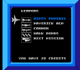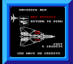 Comme tous les rétrogamers sont beaux, riches, intelligents et sévèrement burnés (et franchement vantards), je sais que vous avez compris où je veux en venir avec mon histoire d'armes secondaires et de thunes : on peut upgrader son vaisseau entre chaque mission grâce aux thunes gagnées ! Vous pouvez augmenter cinq fois la puissance de feu de votre arme principale et acheter trois types d'armes secondaires : les missiles air-air Phoenix Aim54 (4 maximum) qui servent durant les phases de combats aériens, les missiles air-sol Maverick AGM (4 maximum) qui ciblent automatiquement de multiples ennemis et les bombes Hawk (12 maximum) qui se présentent sous la forme de trois grosses boules de feu dévastatrices.