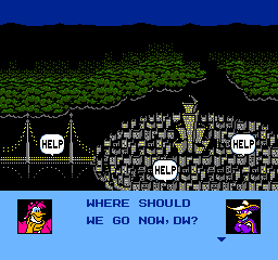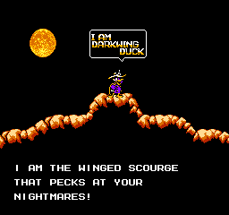 On allume la bête. Petite intro avec Darkwing et sa moto. Ah… Que de souvenirs… Écran titre magnifique, phrase culte « I'm Darkwing Duck » (enfin toute la tirade car ça tout seul c'est quand même léger. Puis on discute avec le vieux, qui nous présente un peu le contexte du jeu. Et Flagada Jones nous demande où on veut aller. Et le jeu commence.