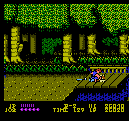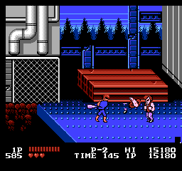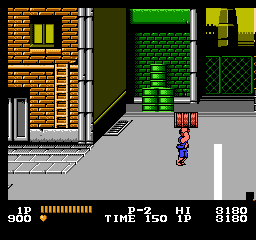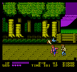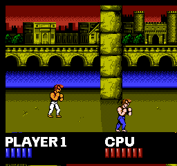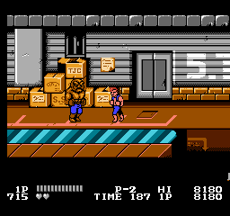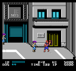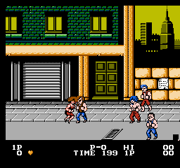 Oui, partout. En borne d'arcade pour commencer, puis sur quasiment toutes les consoles de l'époque. Il existe même une version pour Atari 2600, oui madame. Porté, donc sur plusieurs supports, et décliné en plusieurs versions, dont vous pouvez avoir un aperçu sur notre site, notamment les 3 épisodes Game Boy et les 3 épisodes NES. Episodes NES dont je vais vous décrire le numéro 1 aujourd'hui. Parce que je l'aime bien, ce jeu. Pour toutes les raisons évoquées jusqu'ici : c'est pour moi LE jeu emblématique de ma jeunesse vidéoludique, LA synthétisation de cet univers pseudo MadMaxien, dans une espèce de Bronx en carton-pâte, le tout servi par une lumière du plus bel effet "téléfilm de la Cinq". C'est bien simple, je joue à Double Dragon, et je revois "Bad" de Michael Jackson, les pubs pour Zelda 1, les clips d'Indochine, Chips sur la 5 et Maguy sur Antenne 2 le dimanche soir. Le tout au travers d'un filtre qui me fait penser que le monde, à cette époque, était en couleurs saturées et baveuses. Un monde en VHS, un peu. Ah, on me dit que c'est le composite de merde de la NES, ça fera illusion.