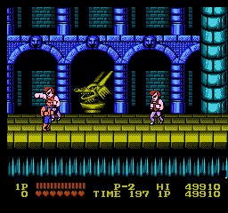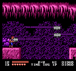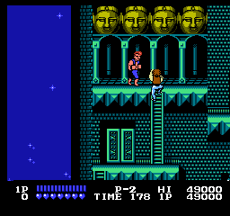 On a donc un jeu propre. Très laid si l'on compare à l'arcade, ceci dit je ne vous parle pas de la Neo Geo, je vous parle de la NES, espèces d'ignares. Donc, laid mais propre. On avance, on satonne. On suit à peu près la trame de la version arcade, un peu de plate-forme par-ci, des niveaux du même genre par là, oui, bon, une conversion d'époque. J'avoue quand même que je me sens moins dans l'ambiance que sur Game Boy, parce que les couleurs pètent vraiment trop, et pour du combat de rue sale et moite, avec la belle palette de la NES, on est plus proche du parc Walibi Schtroumpf que de Blade Runner. C'est bof bof. Et les coups ne sont pas poisseux, je veux dire, ils ne font pas **SCRUITCH** ou **SPROUTCH**, mais plutôt ** SCHRAK **. C'est un peu sec, ça manque de chair et de cartilages écrasés. Arf.