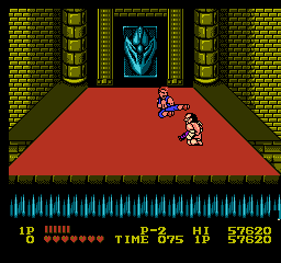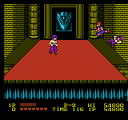 Tertio, le véritable point noir du jeu. Enfin le point noir, c'est carrément un trou, un vortex, l'abyme. Que ceux qui ont usé leurs doigts avec leur meilleur pote sur Double Dragon 2 se joignent à ma colère, à ma peine, à mes pleurs : pas de jeu à deux disponible. Si si, ils l'ont osé. Et là c'est la haine, la vraie. Et c'est tellement impensable que je n'y ai même pas pensé quand j'ai acheté la cartouche. Ne trouvant pas l'opus 2, je m'étais rabattu sur le 1, PERSUADE que, comme pour tout Double Dragon qui se respecte, je pourrais au moins partager cette longue et juteuse aventure. Que nenni. Une fois la cartouche fourrée dans le tiroir de ma NES, je n'en croyais véritablement pas mes yeux, j'ai même cru que ma manette 2 avait un défaut et que c'était pour ça que le second joueur n'apparaissait pas.