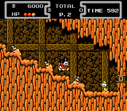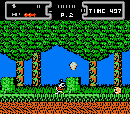 On choisit son niveau et c'est parti ! Picsou avance tranquillement, en donnant un coup de canne dans les coffres pour les ouvrir, ou en sautillant sur sa cane. Et oui ! Picsou a une cane vraiment spécial, genre ressort, avec laquelle il peut tuer les ennemis en leur sautant dessus, ou simplement avancer dans les plates formes en sautant très haut. Personnellement, je passe les 99% de temps du jeu à sautiller comme un con. Je trouve qu'il se traîne un peu la bite au sol en marchant, mais c'est personnel. De plus Picsou est très agréable à manier, et heureusement ! Il répond au doigt et à l'œil, merci Capcom !