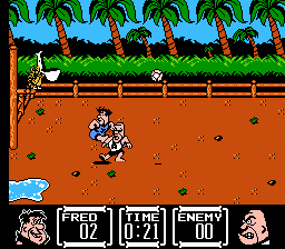 Néanmoins, le jeu est plein de bonnes choses, un peu comme une pizza réalisée avec ce qui trainait dans le frigo. Comme cet arsenal (des haches, lance-pierre et même des œufs explosifs, wahou) à ramasser tout au long des niveaux. Arsenal que vous alimenterez avec les pièces récupérées sur le cadavre de vos ennemis (le monde est déjà d'une lâcheté et sans pitié aucune à cette époque). Il y a aussi cette panoplie de gadgets que vous fournira à la demande la marque de soda/extra-terrestre contre, une fois de plus, monnaie sonnante et trébuchante. À croire qu'il n'y a que le pognon qui compte depuis l'aube de l'humanité. D'autant que lesdits gadgets sont plus là pour faire l'andouille que pour franchir l'obstacle. Mais que voulez vous, chevaucher l'ancêtre du kangourou, ça ne se refuse pas. Olive sur la calzonne, vous pourrez même participer à des matchs de basketball, qui vont permettront justement de débloquer ces joyeux bidules. On tombe dans une sorte de simili-Worcup, castagne comprise.