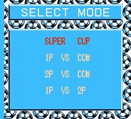 Bon alors donc je choisis play. 4 modes de jeu sont dispo, à savoir super cup (tournoi mondial en 6 poules de 4 équipes), 1P vs COM, 2P vs COM (une première, on est pas obligé de changer de manette pour affronter l'ordi. Ca peut éventuellement être utile aux fétichistes fanatiques du port 2) et 1P vs 2P.