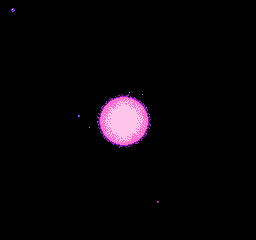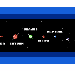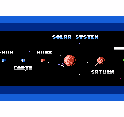 Au rayon du "on fait des petites économies comme on peut", les noms des planètes à la fin de chaque zone ont été retirés de la version japonaise, tout comme l'intitulé "solar system" sur le panorama du système solaire. Ca ne sert à rien, tout comme le défilement sur plusieurs niveaux des étoiles sur le même panorama. Bon là, nous sommes sur une image fixe, pour le mouvement on repassera : regardez donc le nombre d'étoiles affichées, ça illustre bien la chose.