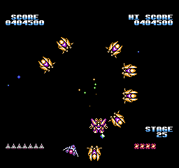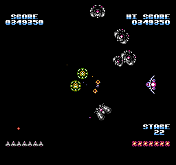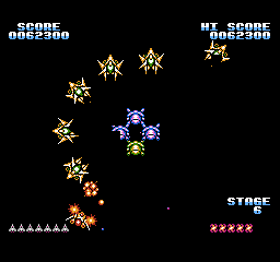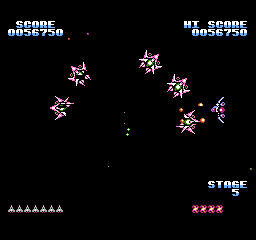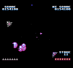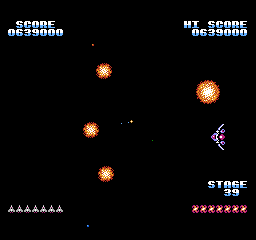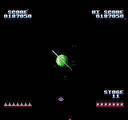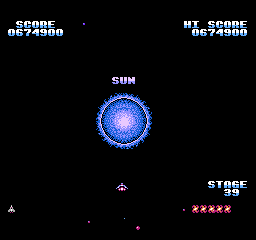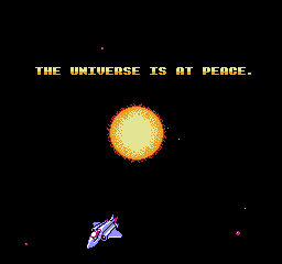 Mais surtout, le jeu se termine sur une petite animation du soleil qui change de couleur, laisse un petit mot clasique du "bravo mec tu as bien joué, rentre chez toi maintenant" puis reboucle sur le premier niveau chez nos amis ricains. La version FDS, quant à elle, dispose d'une vraie séquence de fin qui a sans doute été sabordée pour un gain de place : le vaisseau se carapate et rentre à son bercail, laissant son pilote agiter son bras tout heureux qu'il est. Est-ce la fierté d'avoir sauvé l'espace ou la perspective de recevoir une gâterie cosmique le soir même qui le rend si jovial ? Le mystère reste entier.
