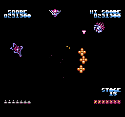 Le capot se referma à nouveau et le vaisseau disparut au loin. Monotone ?, se demanda le gardien à haute voix. Encore un qui n'a rien compris. Le tracé est rectiligne, oui, mais chaque planète possède son identité propre, les vaisseaux adverses n'ont pas les mêmes trajectoires, les ennemis et obstacles sont différents selon la zone parcourue. Que ce soit les premiers croiseurs rencontrés, faciles à éliminer, ou les poseurs de bombes de Vénus (quelles plaies !) et ces nautiles flottants, tout demande son temps d'adaptation, son observation. C'est moins conventionnel que les trajets communs, ça ne le rend pas plus facile. Au contraire ! Et les combats face aux gardiens, les boss comme on les appelle dans le jargon, des affrontements mémorables ! Ce n'est pas en deux pauvres tentatives qu'on va jusqu'au bout, non, même avec le code les vies s'effilochent ! On pourrait déplorer les clignotements conséquents et les légers ralentissements lorsque les hordes ennemies s'accumulent frénétiquement, mais l'action reste fluide malgré tout. Ce circuit est de ceux qui se découvrent, qui se livrent avec l'expérience. Une bien belle aventure en somme.