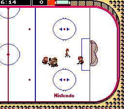 On allume le jeu et on analyse. En considérant le fait que c'est l'un des premiers jeux NES, les graphismes ne sont pas mauvais. Non, ne prenez pas cette phrase au premier degré, vous commencez à me connaître, et donc à savoir qu'il faut être relatif. Tout est très lisible, clair. En même temps c'est plutôt rassurant, vu que la patinoire est obligatoirement toute blanche, si en plus elle était pas lisible... On dira donc que le jeu est lisible car minimaliste. La piste est représentée en mode 3/4 de haut, sans perspective. Heureusement, toutes les tentatives de perspectives sur NES se sont soldées par des échecs. Nos joueurs, taillés pour la sueur et le sang sont petits et peu détaillés. On a droit en fait à 4 types de petits bonshommes : des normaux, des grands et maigres, des gros, et le goal. On les différencie parfaitement, mais ils ne ressemblent quand même à rien, disons le. La plupart du temps une bonne mêlée ne ressemble à rien d'autres qu'une bouillie de pixels toute sautante et toussotante. Ne parlons pas de la foule, composée exclusivement de points de couleurs qui ne varient jamais. On a plus l'impression de statues posées là, à se regarder, se foutant éperdument du match. Et je les comprends, c'est tout de même un sport de looser. Malgré ma piètre opinion de ce sport, je tenais à vous demander, à vous fans de hockey, de bien vouloir accepter mes excuses en cas de crachas plus ou moins volontaires sur ce sport. D'avance, pardon. Les graphismes sont donc vraiment moyens. Mais on ne s'arrête jamais aux graphismes, c'est évident !