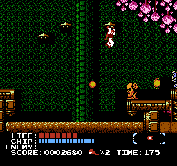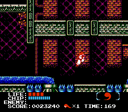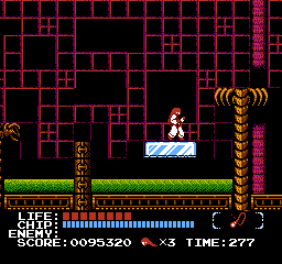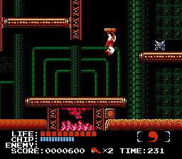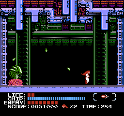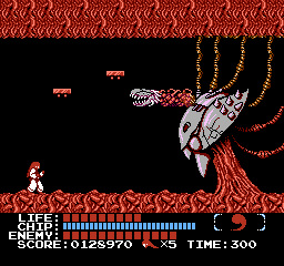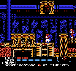 Les graphismes sont magnifiques. Chaque chose est facilement discernable, ce qui est rare dans un jeu NES avec ses 16 misérables couleurs. Les décors sont vraiment superbes, parmi les plus beaux de l'engin. Ils sont animés finement, comme les cœurs qui battent, les gargouilles qui s'agitent... A pleurer. Notre héros chevelu est aussi très finement animé, grâce à une tripotée de sprites. Avec d'ailleurs quelques petites anomalies. Pour sauter il n'y a qu'une frame, alors que donner un misérable coup de poing en prend un bon paquet, c'est amusant... Il n'y a aucun ralentissement, ce qui est vraiment étonna,t surtout quand on voit le niveau de détail de certains Boss, c'est vraiment du grand art hyper optimisé.