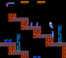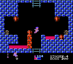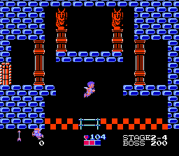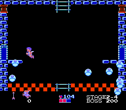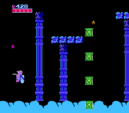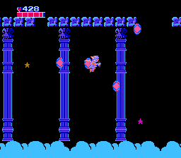 Et des sauts, il faudra en faire un bon paquet ! Le jeu étant un vrai jeu de plate forme de la belle époque ! Alors avec le perso un peu poussif, il faut reconnaître que la difficulté est particulièrement présente. Ce qui d'ailleurs est étonnant dans ce jeu, car les premiers jeux de la console étaient relativement pauvre niveau gameplay, un bon point. Mais le jeu ne se limite pas qu'à sautiller dans tous les sens. Armé de son arbalète, Icare doit aussi éliminer les petites bébêtes volantes ou rampantes qui traînent. Au début on se tape les petits pingouins de rien qui traînent la savate et se laisse tuer, après on se tape les yeux énormes volant en bande qui vont à 100 à l'heure et raffole des petits angelots.