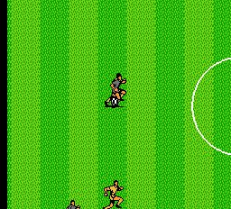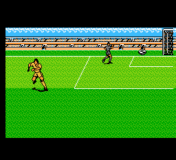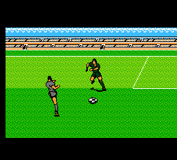 Gameplay où es-tu ? C'est bien ce que tout le monde se demande. Deux boutons donc passe et tir. Si l'ennemi à la balle c'est tacle. Et si elle est en l'air c'est tête ou retourné. Enfin en principe hein. Car si sur le papier tout ça est très classique, dans les faits ça l'est beaucoup moins. Quand vous bougez, tous les joueurs de l'équipe bouge. Oui, un peu comme au baby foot. Ca a l'air de rien comme ça mais c'est exaspérant. Et je ne vous parle pas du clignotement des sprites qui fait parfois disparaître le ballon subitement… genre Copperfield est sur la pelouse. Surtout que le ballon est parfaitement visible pour l'IA. Enfin là je m'emballe un peu, parce que qualifier d'IA ce semblant de bout de code relève de la pure fantaisie. L'IA a la fâcheuse faculté d'être prévisible. Mais prévisible tout le temps. Un peu comme l'huître dans laquelle on verse du citron. Sauf si elle est morte bien sûr… ce qui est pratiquement le cas de l'IA ici aussi. Enfin… Pour Copperfield s'il est parfois sur la pelouse (hop, où qu'elle est la baballe ?) ce n'est pas le cas de l'arbitre. Vous pouvez satonner l'adversaire sans remord. Enfin si vous arrivez à le chopper. Parce qu'à ce petit jeu l'ordi est bien meilleur que vous. En fait c'est très simple, quand un ballon est convoité par deux joueurs, le premier sur la balle a perdu, puisque l'autre le viande dans la demi-seconde qui suit et récupère la baballe (aaaah, a retrouvé la baballe !). On se retrouve donc à freiner désespérément ses courses pour éviter le coup de crampon destructeur.