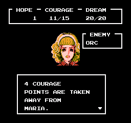 L'action dépense des points de rêve (extensibles via les fragments d'espoir précédemment cités), tandis que chaque nouvel intervenant dispose de sa propre espérance de vie. Du coup on en vient à contrôler plusieurs combattants, les combats en deviennent plus simples, c'est sympa. En revanche ce jeu souffre d'un mal commun aux vieux RPG, à savoir que les ennemis restent ciblés pour un tour, même après leur disparition. Les habitués comprendront, mais il est horripilant de perdre une ou deux actions dans le vent alors même que l'infâme affreux vient d'être occis.