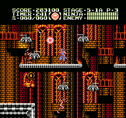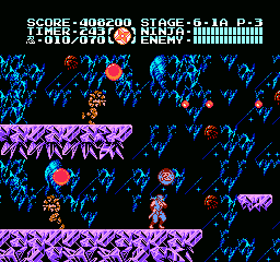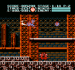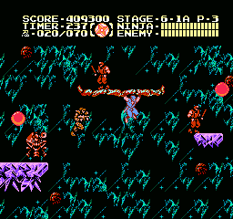 Dès les premières secondes, on ne peut s'empêcher de remarquer quelques différences avec les deux premiers jeux de la série. D'abord le sprite de Ryu a été retravaillé, il est plus détaillé et mieux animé. Ensuite, en bon ninja qu'il est, Ryu peut enfin s'accrocher sous certaines plates-formes avant de se hisser dessus. Il a toujours pu s'accrocher aux murs mais y restait trop souvent collé dès qu'il fallait en bouger rapidement. Il y a du mieux à ce niveau-là, et pouvoir se suspendre sous les plates-formes a permis aux développeurs de jouer avec le gameplay et de nous proposer quelques niveaux plus acrobatiques. On remarque aussi que les boules contenant les armes, leurs recharges et les items pour augmenter la taille du stock d'armes secondaires sont « transparentes ». Du coup on voit ce qu'elles contiennent et on a plus besoin de trancher celles qui ne nous intéressent pas. Dernière différence notable : Ryu pousse désormais un petit cri lorsqu'il donne un coup de sabre. Rassurez-vous, c'est beaucoup plus discret qu'une Monica Seles en rut frappant une balle de tennis, on s'y habitue très vite.