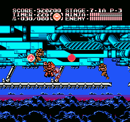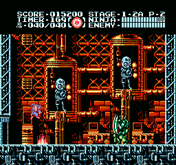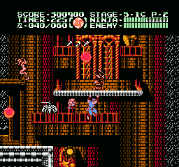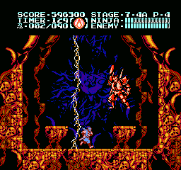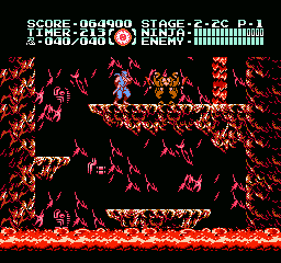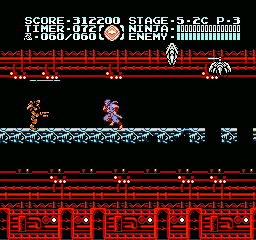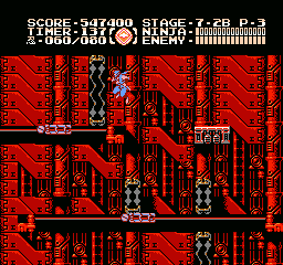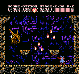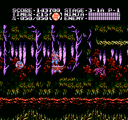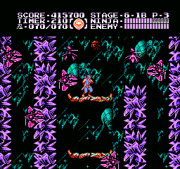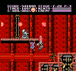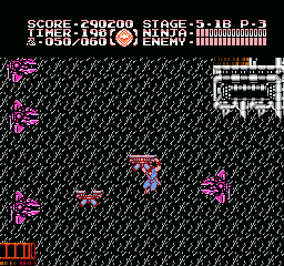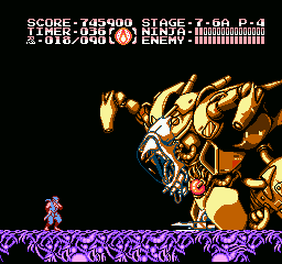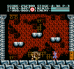 Et bien sachez que Ninja Gaiden III vaut largement le coup d'être essayé (et adopté). J'irais même plus loin : à l'instar des trilogies Super Mario Bros et Castlevania sur NES, le troisième volet clôture la série en apothéose. Et tant pis si certains trouveront que j'y vais un peu fort. Alors OK, dans les deux autres trilogies citées, il y avait de grandes différences de gameplay entre les épisodes, ce qui n'est pas le cas ici. Mais à aucun moment je ne me suis senti blasé, ce qui, vu le fait que les trois jeux sont très similaires, est tout de même un bel exploit. Si Shadow Warriors II était une belle amélioration de Shadow Warriors, Ninja Gaiden III va encore plus loin. Je l'ai déjà dit, le sprite de Ryu a été amélioré, mais tout le bestiaire a aussi été renouvelé. Il ne s'agit pas un simple lifting mais d'un bestiaire inédit. Les nouveaux décors sont très différents d'une séquence à l'autre, les graphismes sont plus fins, plus agréables, la maniabilité a évolué dans le bon sens, elle est moins punitive qu'avant, notamment lors des sauts puisqu'on n'est plus éjecté en arrière quand on se fait toucher dans les airs.