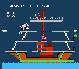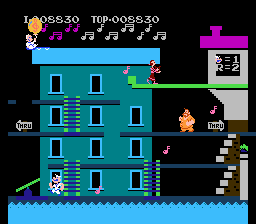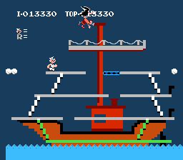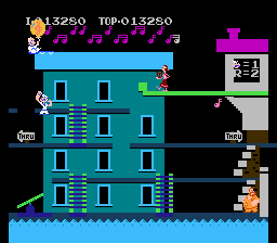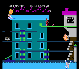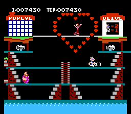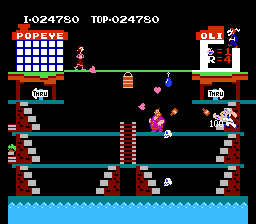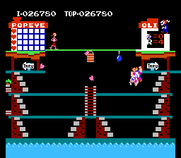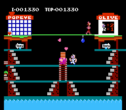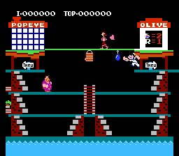 L'adaptation de ce dessin animé sur NES, c'est une galipette vers une autre époque. L'époque de l'impérialisme de l'arcade dans le monde vidéoludique. Les cabinets gloutons en petites monnaie régnaient en maîtres et donnaient le la et la plupart des autres notes dans le secteur de l'amusement sur écran cathodique. Par conséquent, ce qui cartonne dans les salles enfumées et sentant la bière de table est rapidement transposé dans nos foyers, par le biais de cartouches remplies de bits et de bonheur. Et un style de jeu qui s'en ressent. Car l'arcade, c'est la cantine d'entreprise du jeu vidéo : simple, direct, cherchant avant tout l'efficacité. Du coup, le principe de ce Popeye ne casse pas trois briques à un canard. Chaque tableau suit le même axe : Olive est perchée dans un coin de l'écran et vous balance des items que vous devrez récupérer dans leur intégralité pour passer au tableau suivant. Cruelle réalité du monde du jeu vidéo, les choses ne sont pas aussi simples puisque l'ignoble barbu viendra tenter de vous empêcher de batifoler avec l'autre trumeau. S'en suit donc un chassé-croisé qui faisait le bonheur du public qui s'en tapait sur les cuisses dans les années 40. Trois décors et retour à la case départ. Hmm hmm, je vois. Le ludisme des origines : la bête course au point, le scoring de bas étage. Une résurgence des bas instincts, où l'homme ne se résume qu'à une suite de contractions musculaires prédéfinies qui se répètent en une sarabande infernale. Les niveaux s'enchaînent, avec une difficulté supplémentaire à chaque cycle. Ajoutez à cela les incontournables épinards pour botter le fion de l'espèce de Bud Spencer alcoolique, des éléments du décor utilisables comme vague moyen de défense et basta.