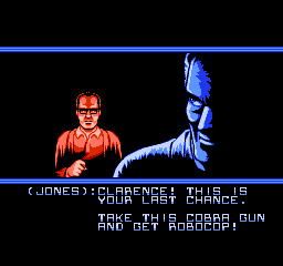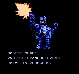 J'insère la cartouche. Musique sympa, intro saisissante où on a l'impression que RoboCop dit « blablabla », prend son gun, et tire. Et c'est seulement après avoir tiré qu'il va à la recherche des voyous. Mmmm, y a comme un truc qui cloche dans l'ordre des événements… Bon on s'en fiche, ça en jette. Première chose à dire, le jeu est très dur. Les voyous apparaissent des deux côtés de l'écran de manière très rapide. Comme RoboCop marche à deux à l'heure, ça se joue parfois à des réflexes. Les méchants ne sont pas difficiles à tuer, un coup de poing ou un tir suffi à les descendre, mais les boss sont quant à eux, beaucoup plus longs à neutraliser.