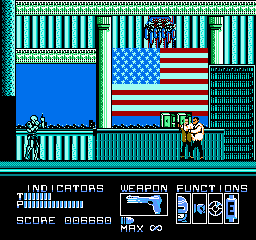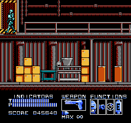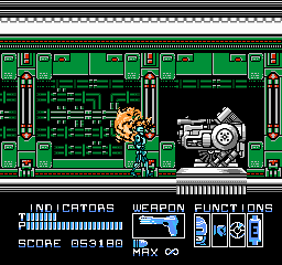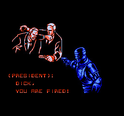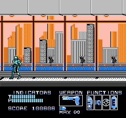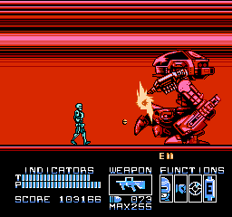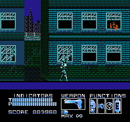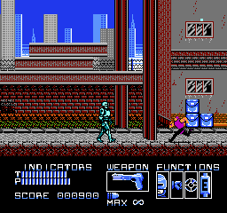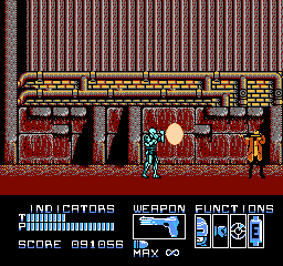 RoboCop peut mettre des patates (enfin des grosses patates métalliques), ou tirer dans sept directions différentes. Il est résistant, peut se protéger (avec le bouton « SELECT »), possède une autonomie sur batteries limitée dans le temps, une vision thermique (qui se déclenche toute seule dans le deuxième monde), et un pistolet de base redoutable, les munitions étant infinies pour ce dernier. Autre point intéressant, RoboCop ne peut pas utiliser son arme n'importe où. Celle-ci sort ou bien se range dans sa cuisse (comme dans le film), en fonction de la progression dans le stage. On peut également ramasser un fusil mitrailleur, ainsi qu'un « Cobra », le fusil d'assaut redoutable de Clarence Boddicker. Enfin, RoboCop ne peut pas courir ni sauter. J'ai parlé un peu plus haut de sa lenteur, et du fait que donner un coup de poing ou tirer une balle sur un voyou peut le tuer. J'en conclus que c'est un jeu réaliste, et fidèle au film. Le gameplay est donc cool sur ce point.