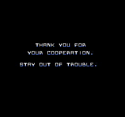 A la fin, on nous remercie pour notre coopération, en nous demandant d'éviter les ennuis. On nous file le score final, on dit qu'Ocean a développé le jeu, et « à bientôt ». Rien que ça ! Même pas un générique avec les noms des développeurs, des designers, des compositeurs, etc. Ocean, c'est tout.