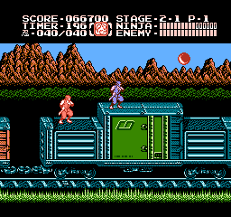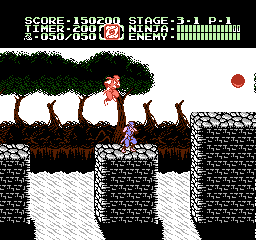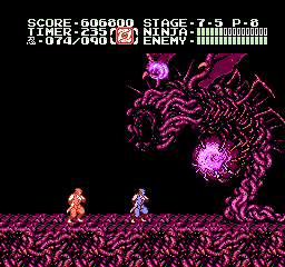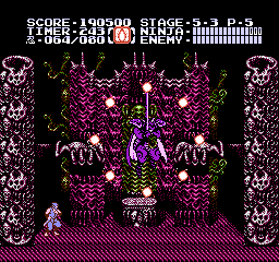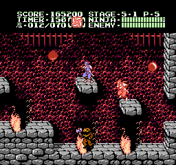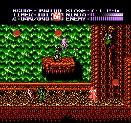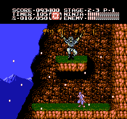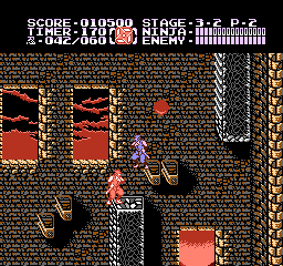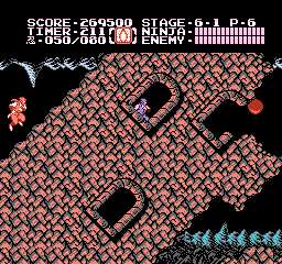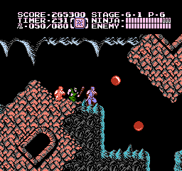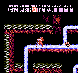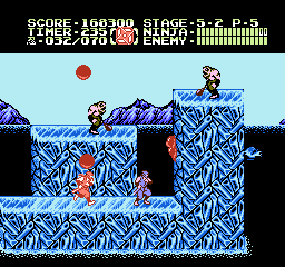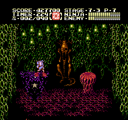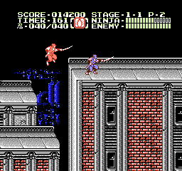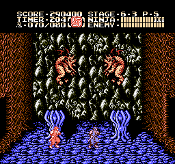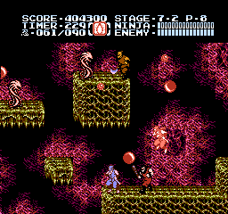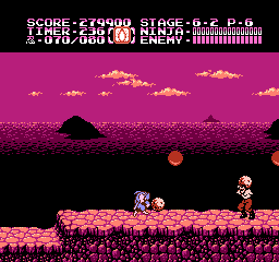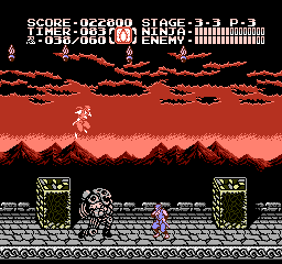 On peut considérer que ces changements sont des ajustements mineurs. Soit. Mais les améliorations les plus notables sont à mettre au crédit des graphismes, de l'animation et du game design. Là où Shadow Warriors s'en tirait plus qu'honorablement, privilégiant le rythme et l'action, sa suite améliore encore grandement les choses. Les graphismes sont beaucoup plus variés, on ose jouer la carte des mélanges de couleurs et des palettes plus criardes. On change aussi vraiment d'environnement d'un monde à l'autre, c'était moins le cas dans le premier opus. Mention spéciale pour le niveau 6-1 qui n'aurait pas fait tache dans un Castlevania, ou encore le 7-2 qui a des décors qui ne sont pas sans rappeler Contra/probotector. Si les animations de Ryu et des ennemis sont souvent basiques, on a désormais beaucoup de mouvement à l'écran sans que l'action en pâtisse. Ce sont principalement les décors de fond qui ont été judicieusement animés. Ca rend toujours bien sans pour autant causer de ralentissements. Le level design est quant à lui beaucoup moins répétitif, on nous propose régulièrement de nouvelles situations, de l'eau avec du courant, des vents changeants, des plates-formes seulement visibles lorsque la foudre parle, de la glace où les tabi de Ryu glissent autant que Marie-Pierre Casey sur une table aspergée au Pliz, etc.