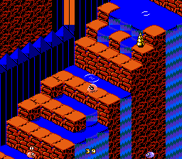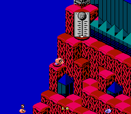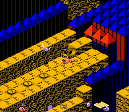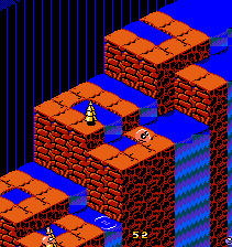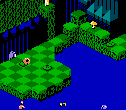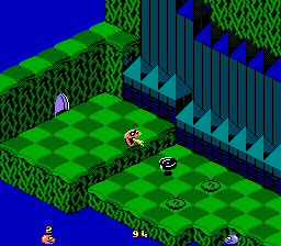 Snake Rattle n Roll est l'un des jeux les plus inhabituels que l'on puisse rencontrer sur NES. L'idée de base est que vous êtes un serpent, qui doit manger tout ce qui est sur sa route d'en bas à en haut d'une montagne pour prendre le drapeau planté tout en haut. Oui, c'est vrai c'est ridicule dit comme ça. Mais ne vous inquiétez pas, les développeurs ont pensé à tout un tas de vilénies à glisser sur votre chemin pour vous empêcher d'arriver là haut. On doit donc manger assez de galets (ce qui fait grossir la queue du serpent, en tout bien tout honneur) pour pouvoir ouvrir le niveau d'après. Snake Rattle n Roll possède aussi un bon gros jeu à deux joueurs, particulièrement jouissif car en simultané. Mais ne perdons pas de temps. Vous avez sûrement remarqué que le jeu représente une superbe vue en 3/4 d'en haut. C'est beau, c'est pas si courant que cela sur NES, mais cela pose aussi quelques problèmes. Suivez le guide, qui au passage n'est pas rémunéré, alors je vais passer parmi vous avec un tronc...
