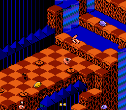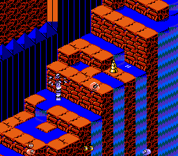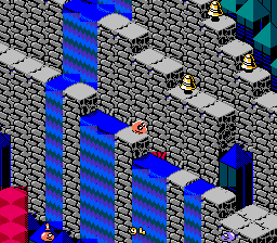 Aussi loin que les graphismes de la NES puissent aller, ce jeu est au rendez vous. Ils sont superbes. Cela est en partie dû à la vue isométrique, et aux couleurs bien pétillantes de malice du jeu. Les niveaux gagnent ainsi un petit cachet "surréaliste" du plus bel effet. Les serpents, ennemis et autres objets sont exceptionnellement beaux, de même certains objets font "résultats de rendus"... On pourrait faire son gros relou en disant que les objets sont un peu petits, ce qui n'empêche pas de voir à quoi ils ressemblent. Certains sont même particulièrement attachants. J'aime à voir cette cuvette de toilettes qui me regarde méchamment du coin de l'oeil, prête à me bondir au cou, tout en lançant des champignons. Mais ce serait sans compter sur le disque vinyle qui rebondit partout, ou encore le pied géant qui sort d'un trou quelconque. Oui, on peut le dire, les graphismes sont magnifiques.