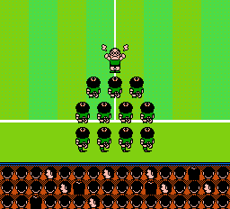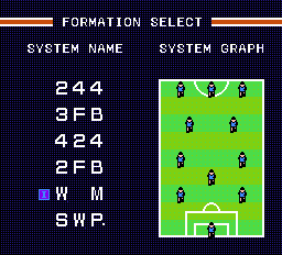 Suit un grand moment de solitude. Autant je me targue d'être assez calé en football, autant là les choix de stratégie qui m'ont été proposés mon laissé sur le cul. A part deux trois modes classiques, je n'ai jamais entendu parler des autres… et je ne les comprends toujours pas. Bon c'est pas trop grave non plus hein, on est sur NES alors ne vous attendez pas à élaborer un tactique digne des Français des Italiens des Grecs (j'ai toujours du mal à m'y faire…).